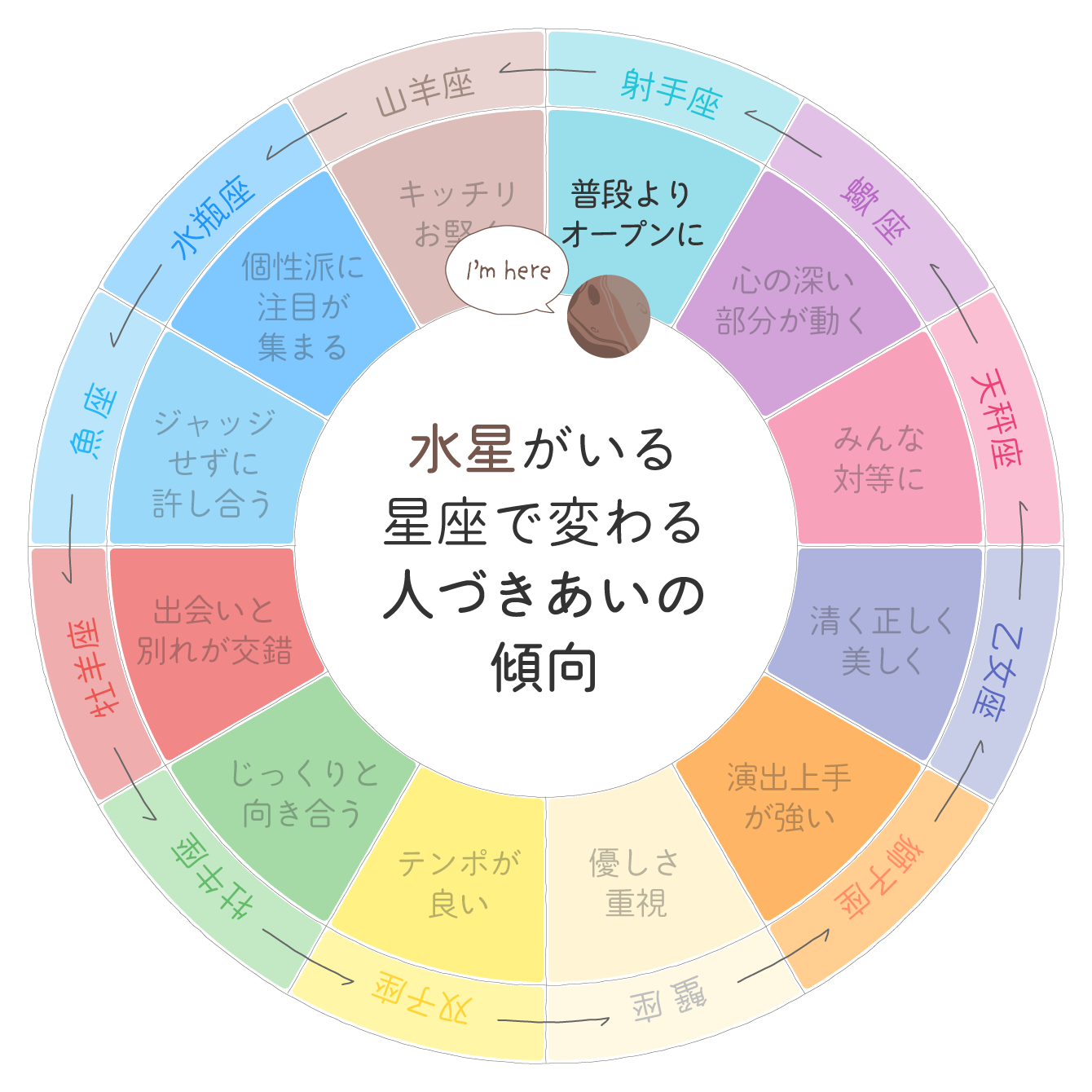 一般的に「私は◯◯座です」というのは、生まれた日に地球から見て太陽がいた星座のこと(ここでは「太陽星座」と呼びます)。同じように、今現在水星がどの星座を移動しているのかということを、「今、水星が◯◯座にいる」と表現しています。